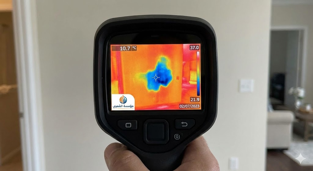 نستخدم كاميرات حرارية متطورة لرصد الفروقات في درجات الحرارة داخل الجدران. المياه المتسربة تظهر بلون مختلف (عادة أزرق بارد) مقارنة بالمحيط، مما يكشف مسار التسرب بوضوح.